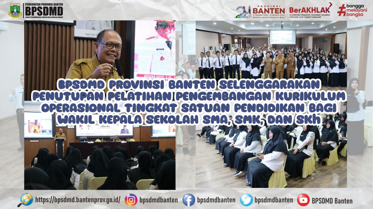 Sumber Gambar :Pandeglang – Badan Pengembangan Sumber Daya Manusia Daerah (BPSDMD) Provinsi Banten resmi menutup kegiatan Pelatihan Pengembangan Kurikulum Operasional Tingkat Satuan Pendidikan yang diikuti oleh para Wakil Kepala Sekolah jenjang SMA, SMK, dan SKh se-Provinsi Banten, pada Selasa, 30 September 2025.