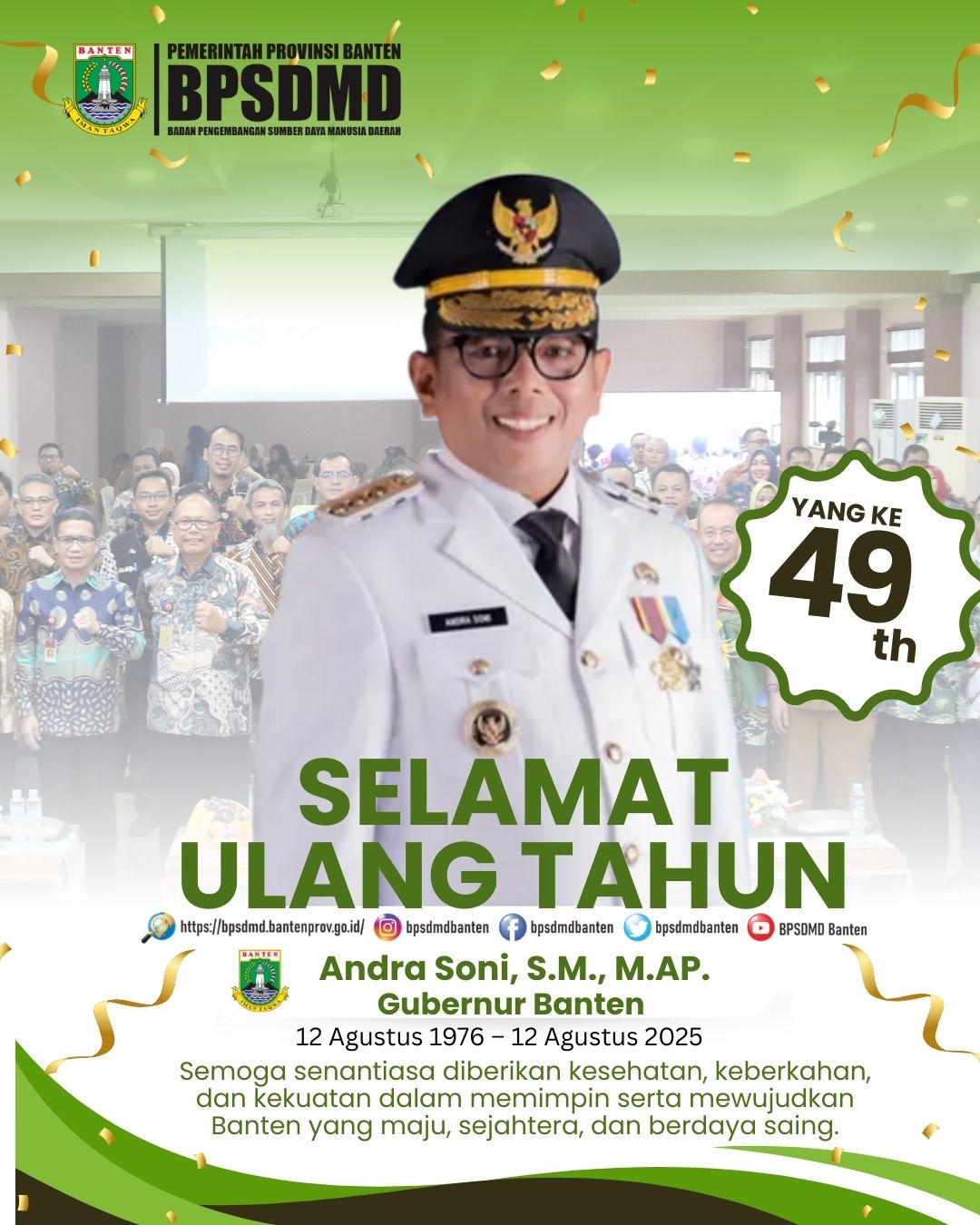 BPSDMD Provinsi Banten Mengucapkan Selamat Ulang Tahun ke-49 kepada Gubernur Banten Andra Soni, S.M., M.AP. 12 Agustus 1976 – 12 Agustus 2025 Semoga senantiasa diberikan kesehatan, keberkahan, dan kekuatan dalam memimpin serta mewujudkan Banten yang maju, sejahtera, dan berdaya saing.