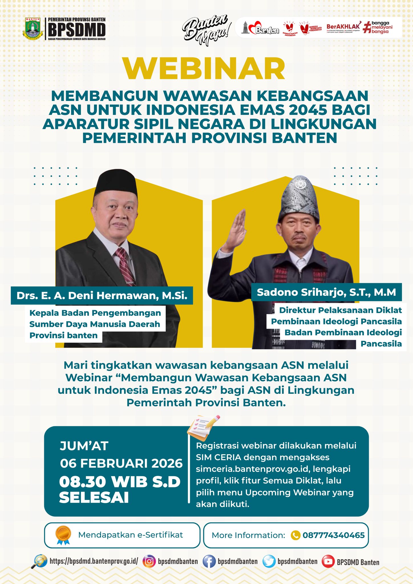 Dalam rangka peningkatan wawasan kebangsaan ASN, Badan Pengembangan Sumber Daya Manusia Daerah (BPSDMD) Provinsi Banten mengundang seluruh Aparatur Sipil Negara (ASN) di Lingkungan Pemerintah Provinsi Banten untuk mengikuti webinar: